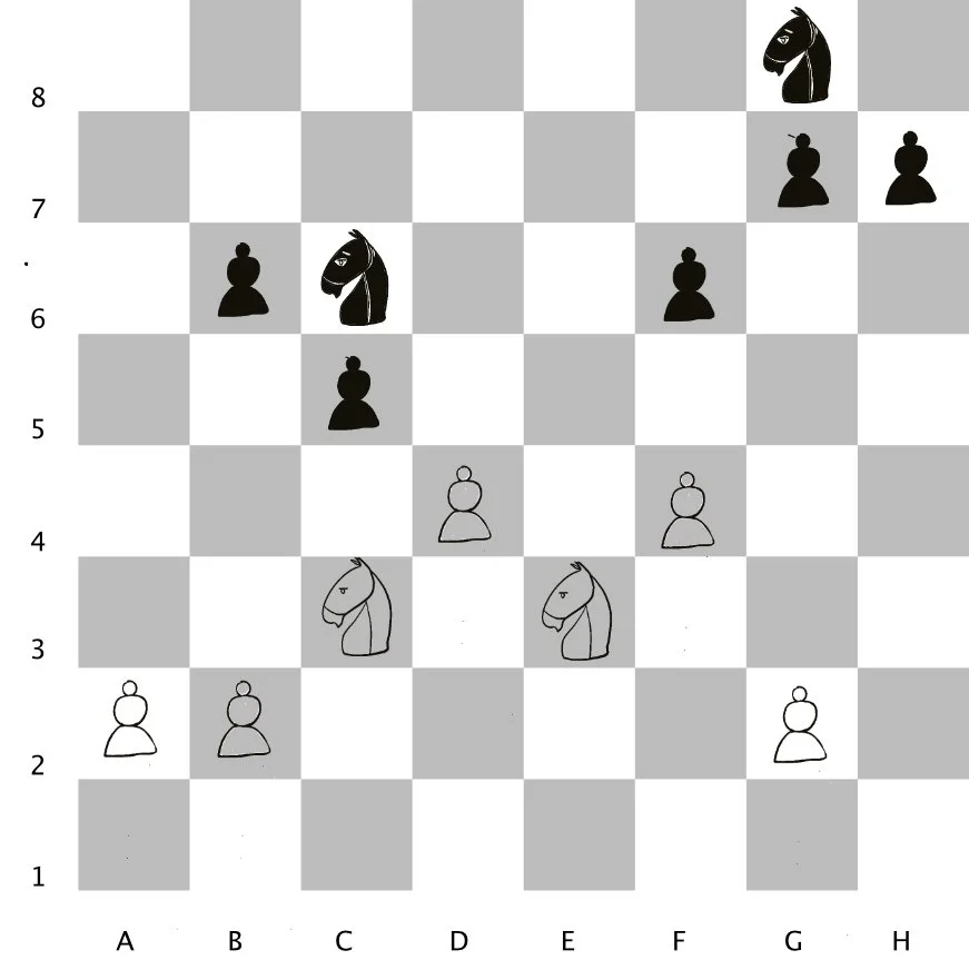 First Game: 1 Knight + Pawns vs 1 Knight + Pawns. Second Game: 2 Knights + P’s vs 2 Knights + P’s. Third Game: K, 2 R’s, P’s + 2 Knights vs K, 2 R’s + P’s + 2 Knights.