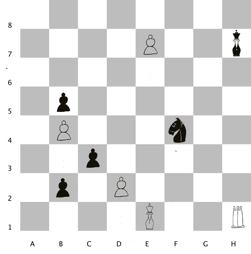 Board 1: Here we have two pawns in a race to promotion. Who do you think will reach their opponents side of the board first? Yes, Black will promote first! And how many squares, or steps does each pawn have to travel before reaching the end of the board? White has three steps to go and Black has two! What piece will the Black Pawn choose to become? A Knight, Bishop, Rook, or Queen? Which would you choose and why?
