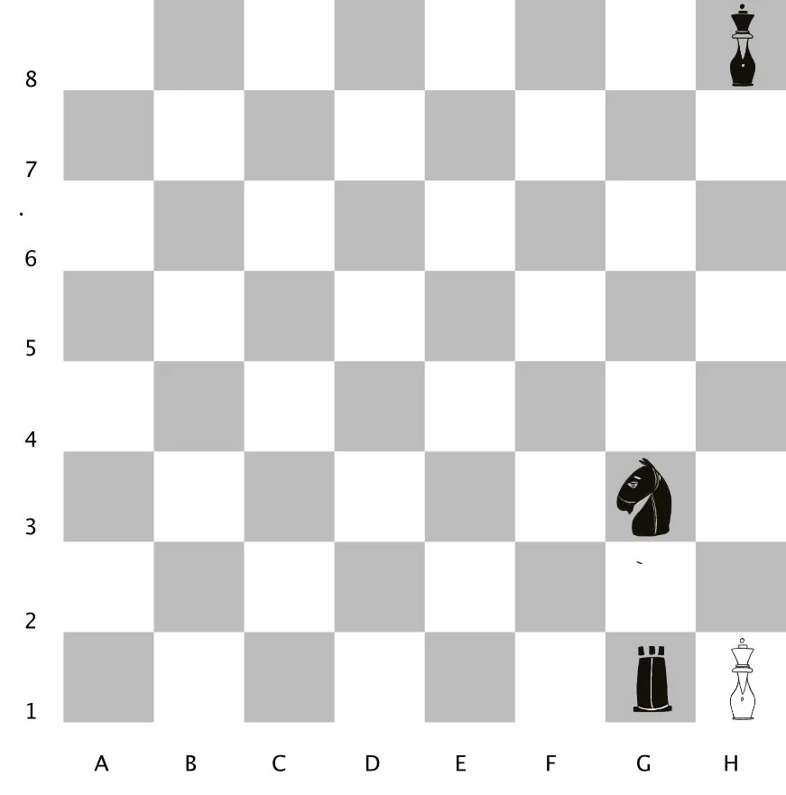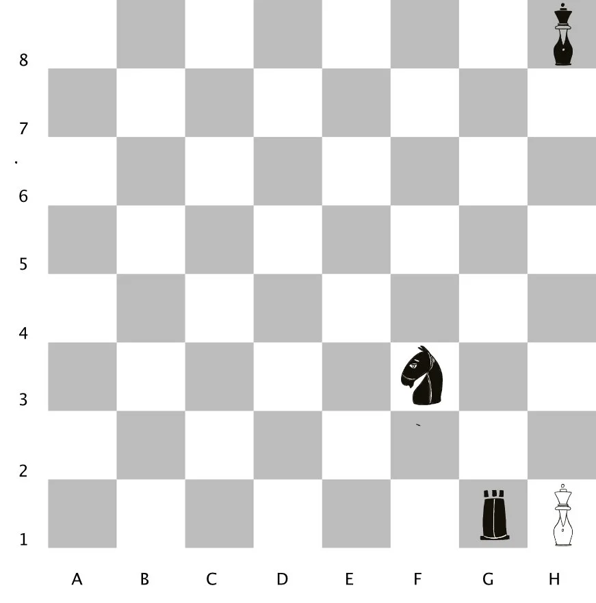 Board 3: Check! (Both the R & the N have put the K in danger/check but he can Move and/or Capture his way out of danger)